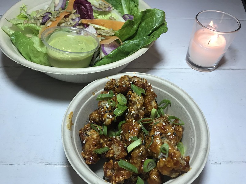 I was so delighted by the Korean fried popcorn chicken. Korean fried cauliflower is also available. The flavor is spot on. Plus, check out the Evan Kleinman vegetable plate. It features farmers market finds and is named after KCRW’s Good Food host Evan Kleinman.